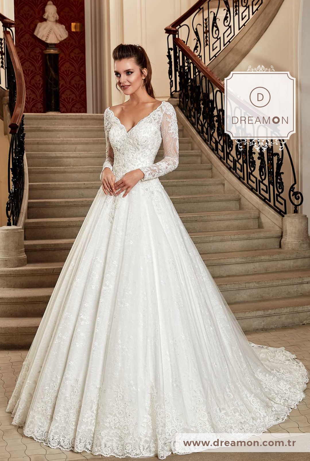 Etek kenarlarına kadar inen özel işlemeli dantelleriyle derin sırt dekoltesiyle A kesim V yakalı uzun kollu gelinlik modeli. Sonbahar ve kış düğünleri için çok uygun klasik bir modeldir.