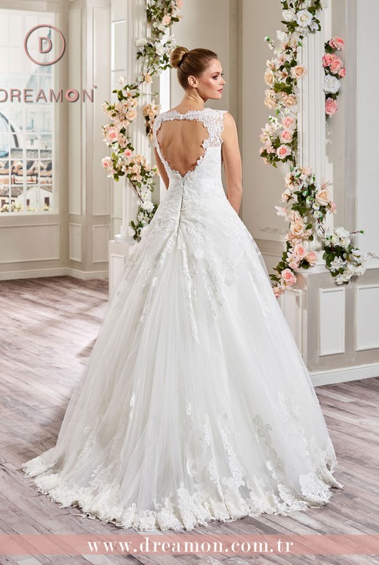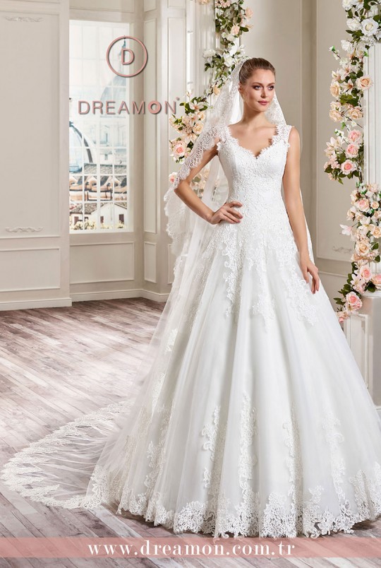 Omuz askılı ve şık sırt dekoltesi barındıran tasarımıyla ön plana çıkan etek kenarı dantel ağırlıklı A kesim gelinlik modeli. Şık bir teras düğünü ya da tarihi düğün mekanının yanı sıra balo salonuna da uygun bir modeldir.