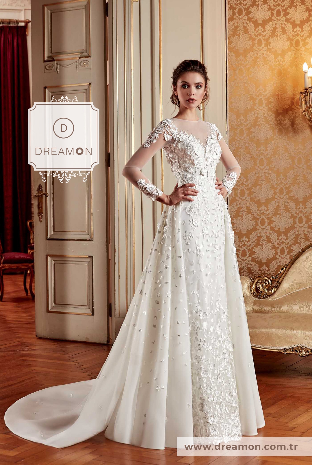 Modern tarzda bir dar etek üzerine belden itibaren genişleyen zengin kuyruk detayları, illüzyon yaka, sırt detayları ve uzun kol yapısıyla saray konseptli düğünlerin vazgeçilmezi olan dar etekli gelinlik modeli en zarif halinizi yansıtacak.