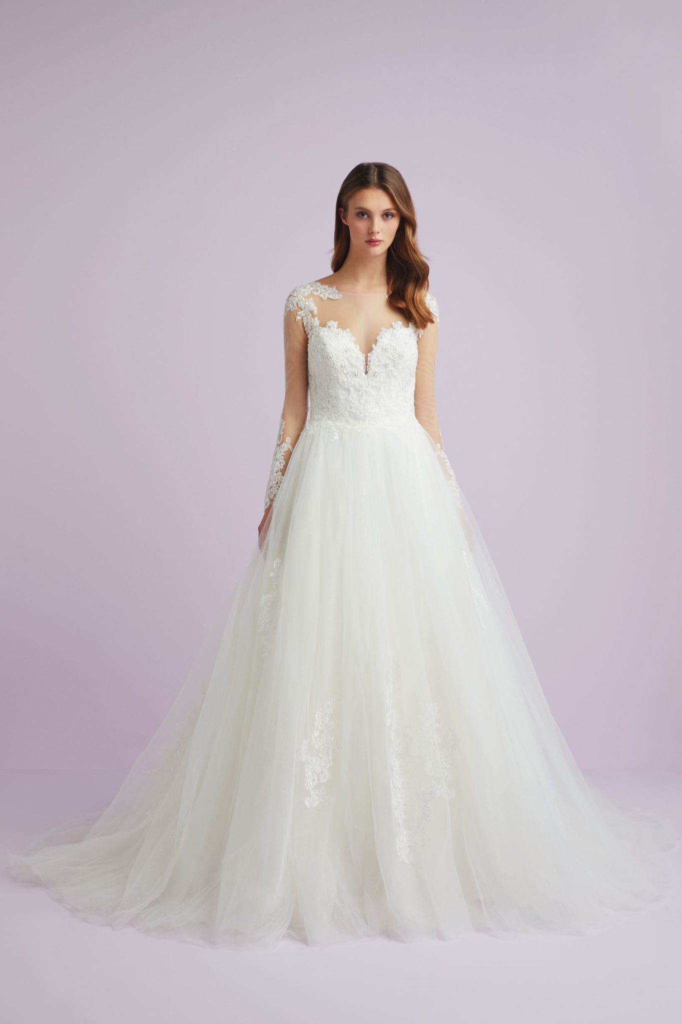 Oleg Cassini İllüzyon yaka, sırt-kol detaylı, üst kısmı payet işlemeli, uzun kollu ve tül etek kuyruklu Balo Tipi Gelinlik ile bütün gözler üstünüzde olacak.