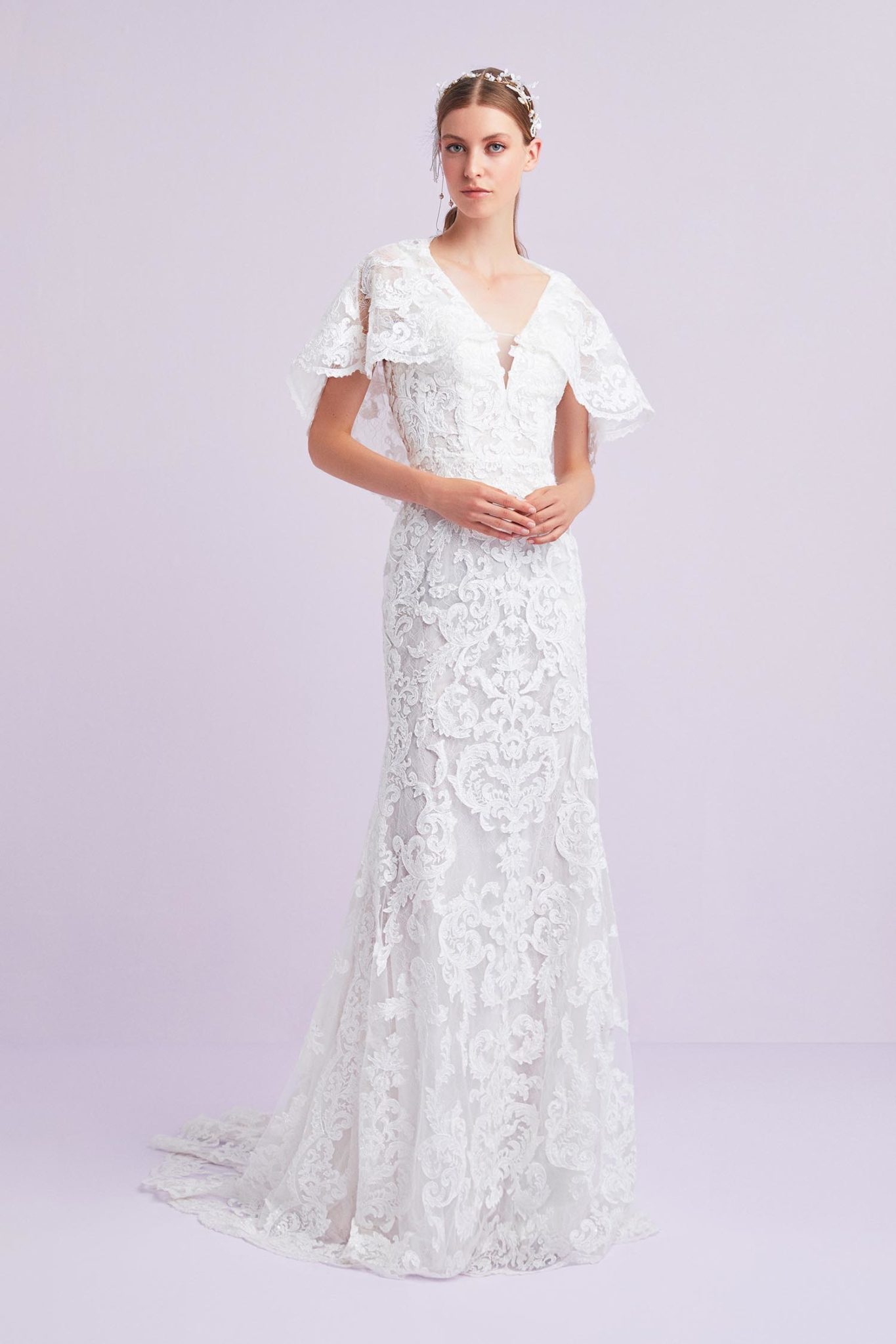 Pelerin modası bu yılda devam ediyor. Farklı tarzda çalışılmış pelerin detaylı, dar kesim ve hafif kuyruklu gelinlik modeli dantel işlemeleri ile de göz dolduruyor.