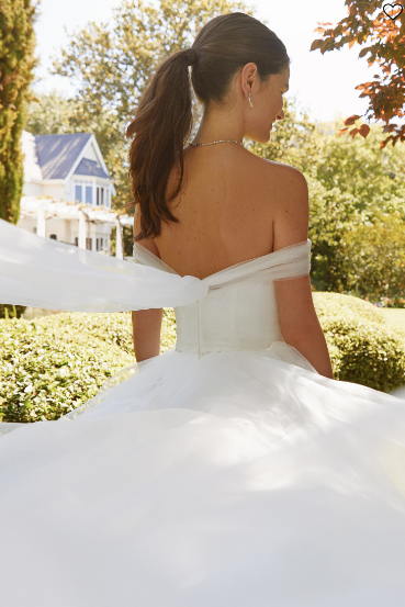 A kesim kayık yaka gelinlikte sırt kısmında fiyonk detayının kullanıldığını görüyoruz. Tül kumaşa sahip bu gelinlik modeli ile yaz düğünlerinin en gözde gelinlerinden biri olabilirsiniz.