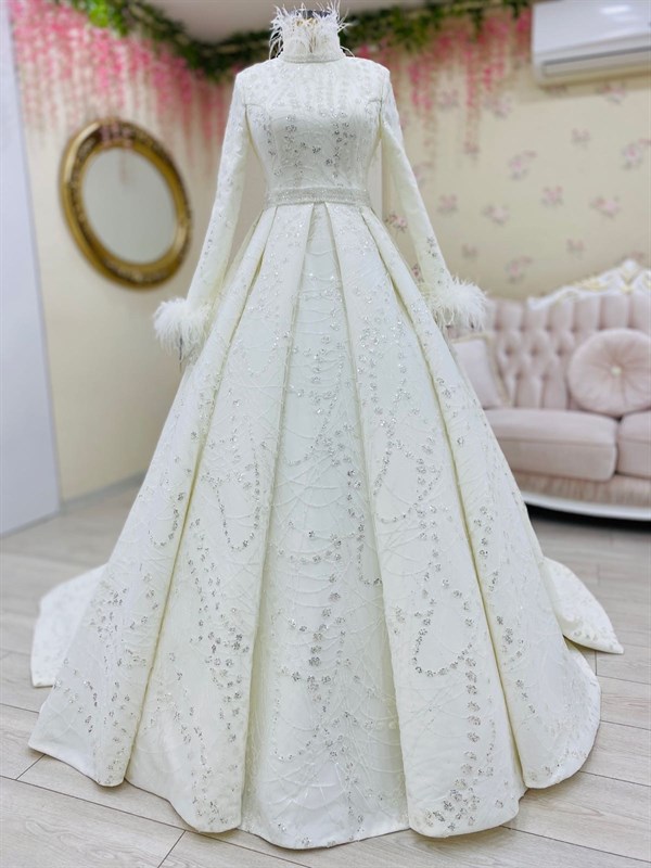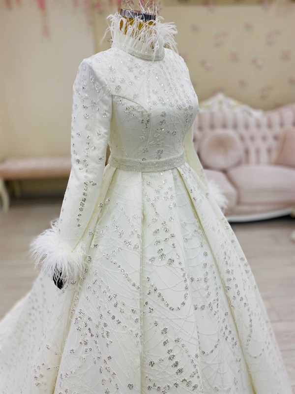 Tüy ve ışıltı detaylarıyla düğün gecesinin gözdesi siz olacaksınız. Bu modeli özellikle havuz başı ve kır düğünü konseptine sahip düğünlerde giymenizi öneriyoruz.