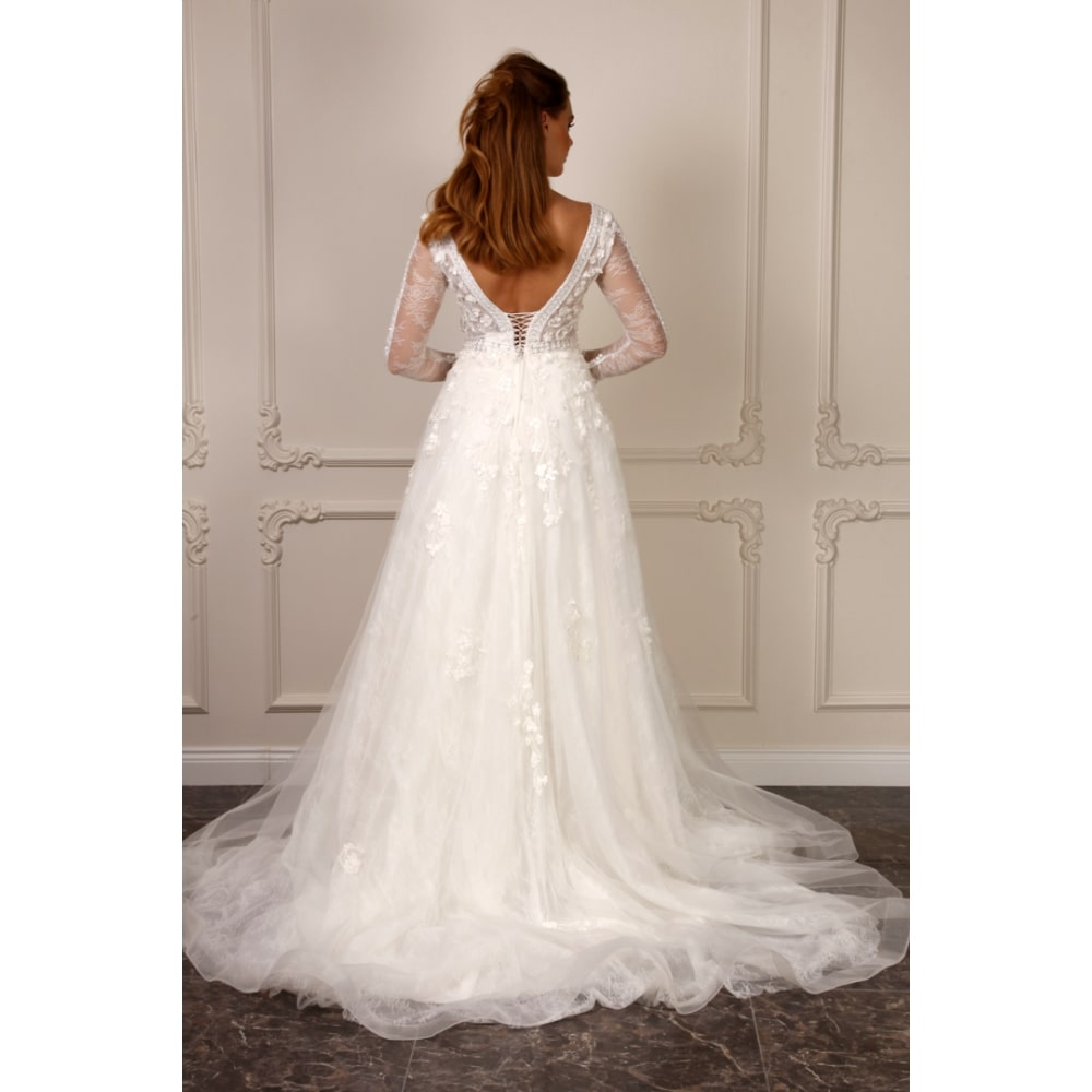 Bu gelinlik yumuşak, tül ve dantel kumaşlı, bohem gelinlik sevenlere göredir. V şeklindeki üst kısmını, transparan ve hafif büzgülü 3/4 transparan kollar tamamlıyor. Bel çevresindeki işlemeler ile vücut hatlarınızı ön plana çıkarabilir ve olduğunuzdan uzun boylu görünebilirsiniz.