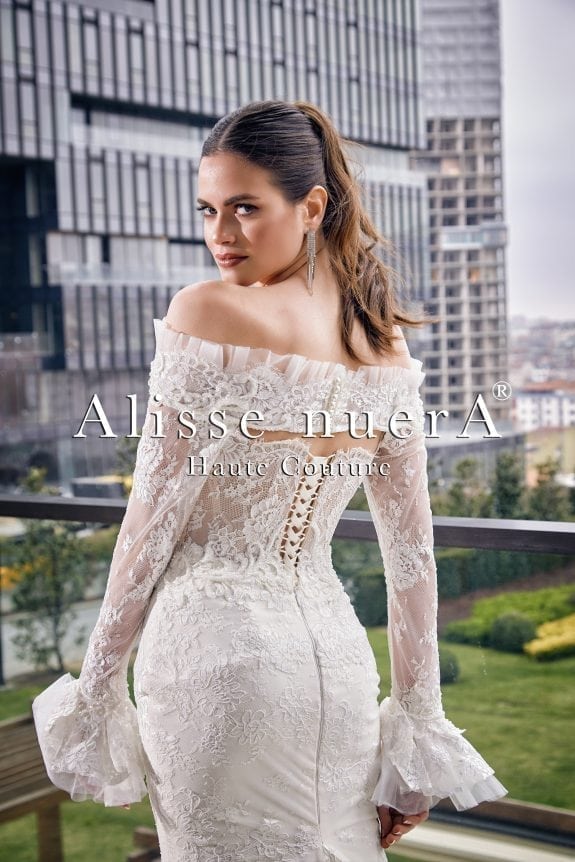 Alisse Nuera İspanyol Tarz Gelinlik Modeli ile göz kamaştıracaksınız. Mükemmeliyetçi gelinlere kusursuz tasarım! İspanyol tarzı kat kat etek ve kol detaylarının hareket kazandırdığı iddialı tasarımın vücuda oturan mükemmel korsajı ile görenleri büyüleyeceksiniz! İşli dantelin göz kamaştıran güzelliğini transparan detaylarda buluşturan yarım balık model bir gelinlik.