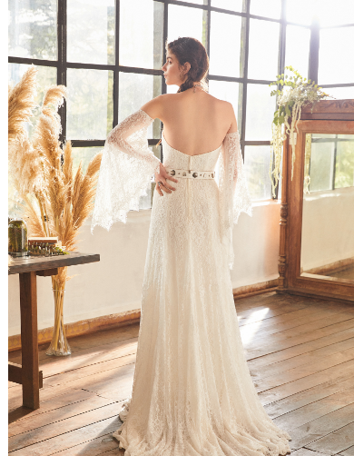 Son yılların modası olan bohem gelinlik modellerine ayrı kol parçası ile bu model bambaşka bir tasarım getiriyor. Dantel işlemeleri ve straples yakasıyla göz alıcı duruyor.