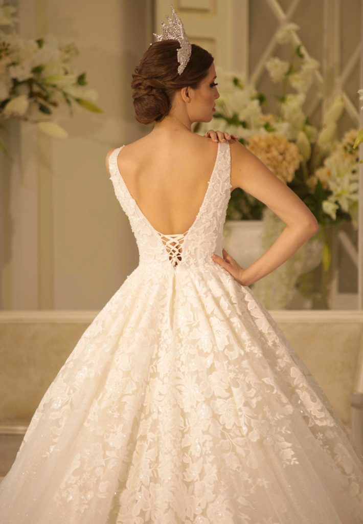 Asaleti muhafaza eden bir yapıt, kol ve sırt deyatları ile bulunmaz bir görünüm. Dantel tül etekli prenses gelinlik modeli.